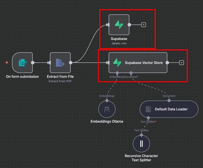 4. 在新開啟的分頁中,選取並刪除 "Supabase" 和 "Supabase Vector Store" 兩個節點。